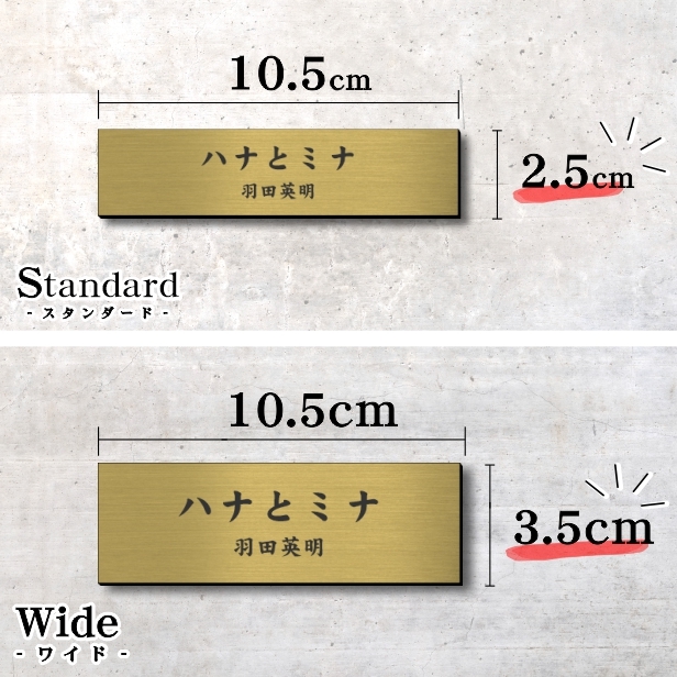 詳細:真鍮風ゴールド/ヘアライン仕上げのアクリル板にレーザーで刻印しています。