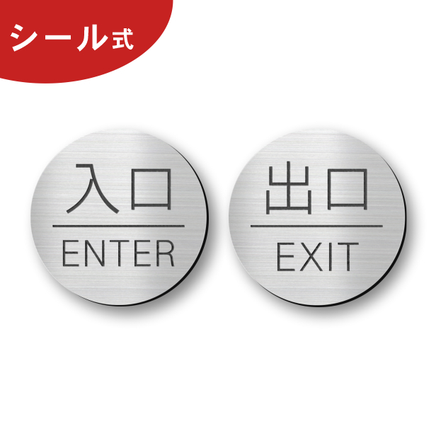入口 出口 ドアプレート サイン (入口 ENTER/出口 EXIT) 丸型 ステンレス調 シルバー 扉 出入口 銀 屋外対応 シール式 メール便送料無料