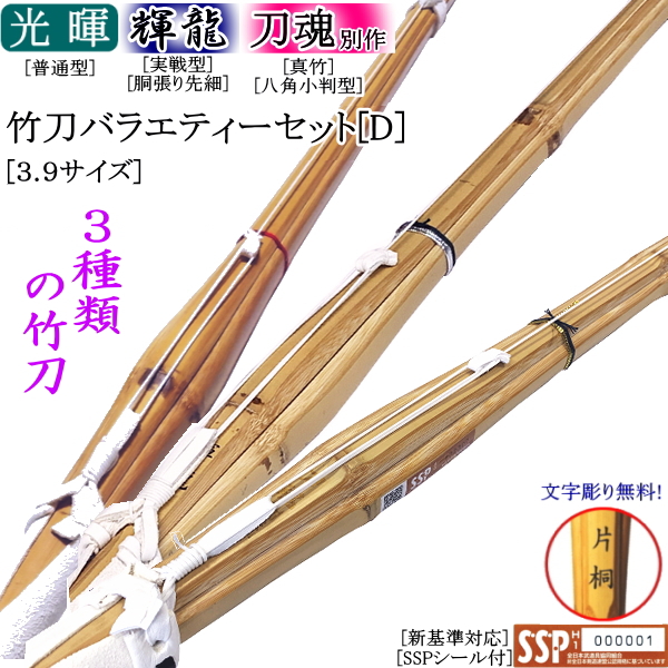 竹刀バラエティー3本セット[D]《光暉》吟風仕組み1本/実戦型《輝龍》W床柄仕組み1本/真竹・八角小判型《刀魂別作》吟風仕組み1本 [3.9サイズ]