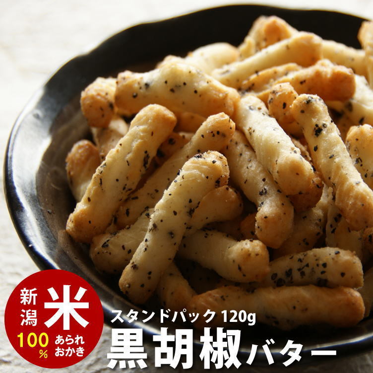 おつまみ お菓子 おかき あられ 黒胡椒バター スタンドパック チャック袋 ※90g おせんべい 新潟 加藤製菓