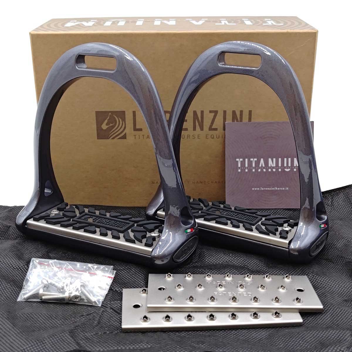 【中古・未使用品】LORENZINI ロレンツィーニ JUMPING STIRRUPS 障碍用鐙 チタニウム ジャンピング ラバータイプ 乗馬 馬術 替えステップ付