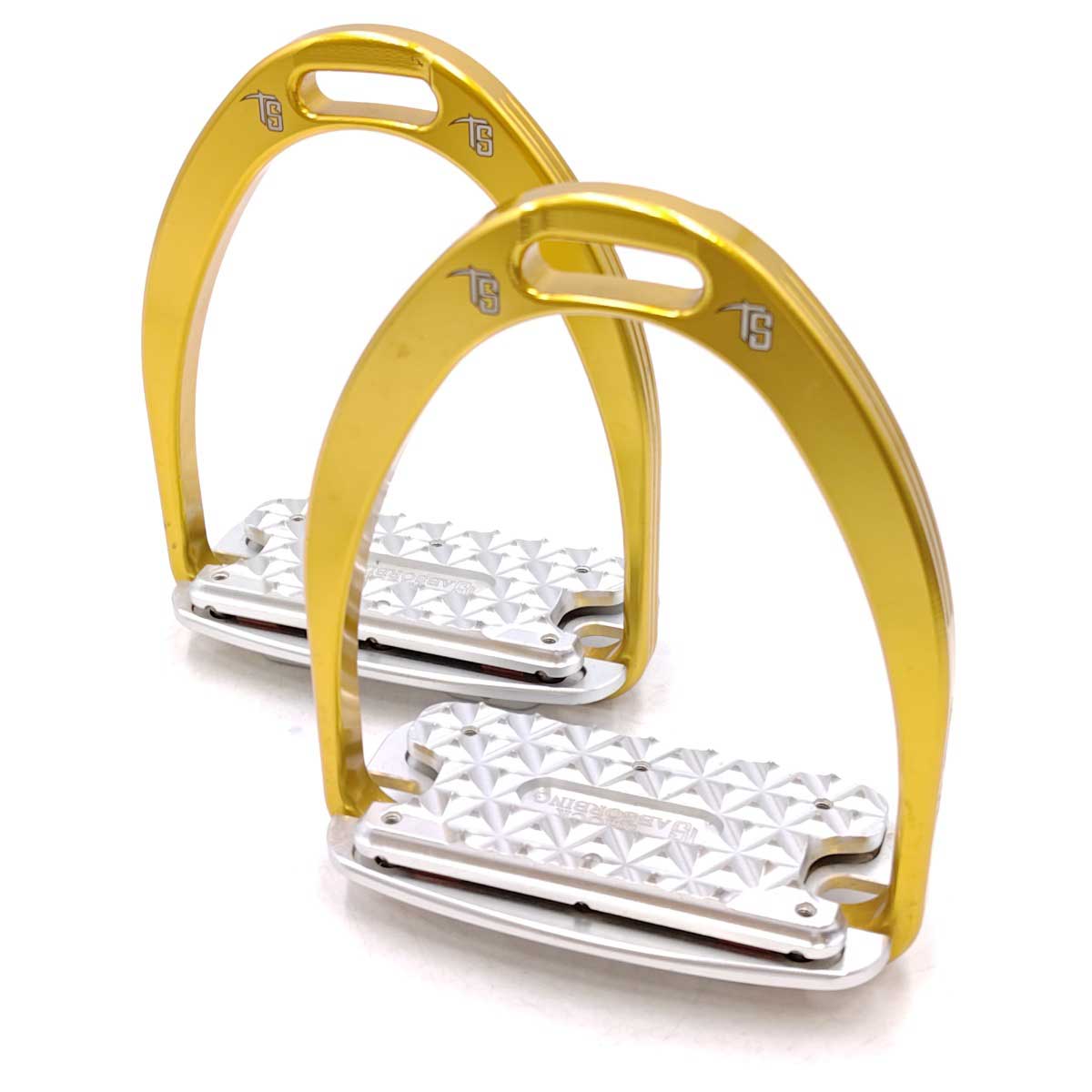 【仕様】 ブランド:TECH STIRRUPS タイプ:Siena シエナ 鐙 重量:ペア約854g カラー:ゴールド サイズ:内側幅約12.5cm×内側高さ約12.5cm×ステップ奥行(突起がある箇所のみ)約5.4cm