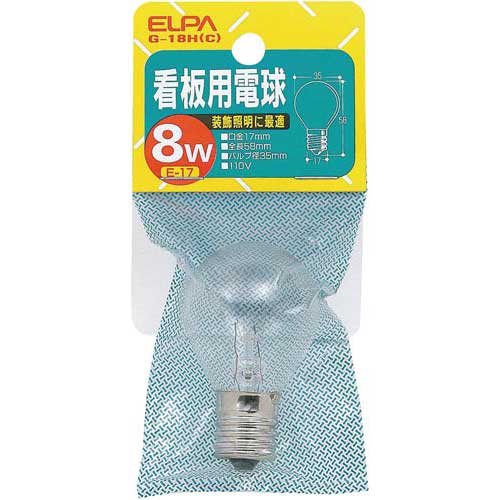 ★商品合計金額3000円(税込)以上送料無料★装飾照明、ディスプレイ、看板用に適した電球です。●口金/口金:E17●寸法/全長:58mm ・バルブ径:35mm●定格寿命/1500時間●定格消費電力/8W●仕様/看板用電球 8W E17 クリア ●質量/約14g●単位/1個●メーカー品番/G−18H