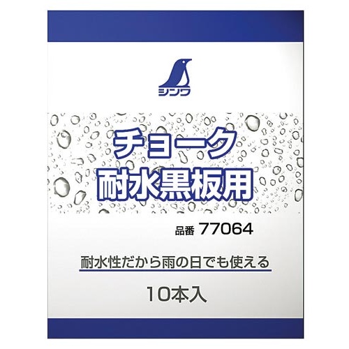 ★商品合計金額3000円(税込)以上送料無料★耐水黒板用チョークで雨の日でも使えます。耐水黒板以外のアスファルトやコンクリートにも使用できます。紙が巻いてあるので手を汚しません。●寸法/パッケージサイズ:縦115X横90X高さ23mm●カラー/ホワイト●質量/100g●材質/本体:油性(顔料)●仕様/製品サイズ縦70mmX横11mm●仕様/耐水性入数:10本入●単位/1個●メーカー品番/77064※本来の用途以外に使用しないで下さい。※取り扱い説明をよく読みお使い下さい。※本体に強い衝撃等を与えないで下さい。