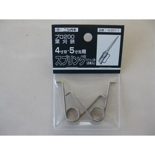 ★商品合計金額3000円(税込)以上送料無料★ニシガキプロ200葉刈鋏4寸刃・5寸刃用のスプリングです。●寸法/パッケージサイズ(約)縦110X横70X高さ7mm●質量/14g(1ケ当たり4g)●材質/ステンレス●仕様/プロ200葉刈鋏4寸刃・5寸刃用入り数:2個●単位/1個●メーカー品番/Nー207−1※警告:本品は金属です。※電気を通しますので感電の恐れのある場所では使用しないで下さい。※先端は鋭利な刃物です。※刃物部分にはいかなる時でも手を入れないで下さい。※ストッパー部で指を挟むことがありますので、指を近づけないようにして下さい。※使用後は刃物部分を閉じて、開かない様にして下さい。※又、子供の手の届かない場所に保管して下さい。※注意:本品は使用用途以外に使用しないで下さい。※使用前にはネジのゆるみ、部品の損傷がないか点検をし、安全を確かめてお使い下さい。