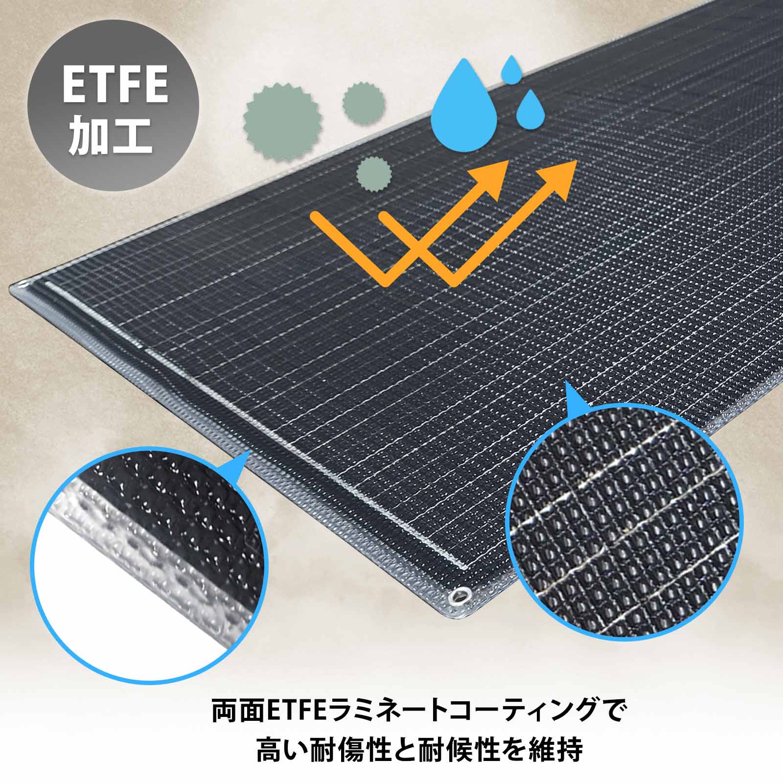 ETFEコーティングのソーラーパネルは前面だけが多い中、両面に日本製ETFE素材を使用しています。