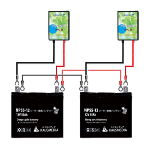 DC12Vバッテリーを並列接続にて複数ご利用時、または直列接続による24Vでご利用の場合、バッテリー1台に対してクリスタルパルサーを各1台づつ接続することをおすすめします。