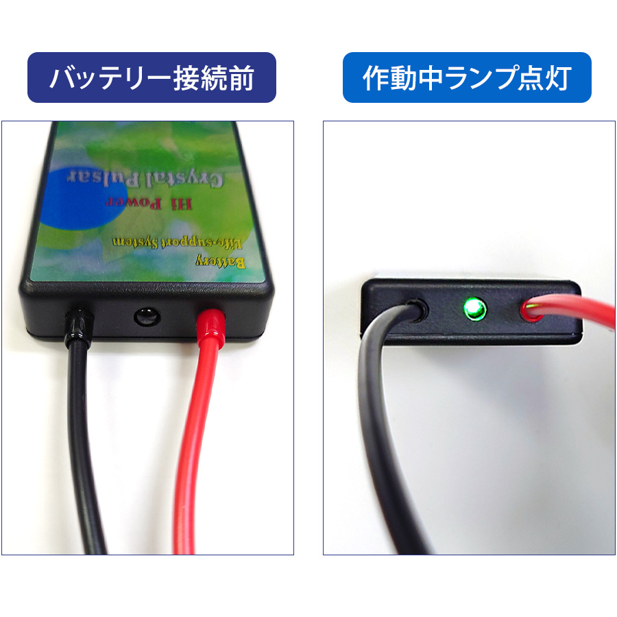 バッテリーへ接続後、クリスタルパルサー本体の側面にあるLED(緑)が点灯しているかご確認ください。
