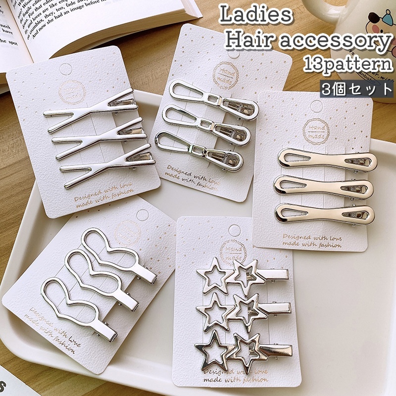 ヘアクリップ 3個セット レディース 女性 婦人 大人 髪留め 髪飾り ヘアアクセサリー シルバーカラー 銀色 星型 リボン型 ハート型 シンプル お