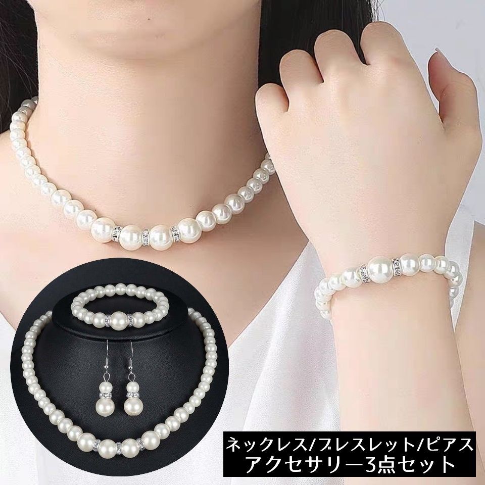 アクセサリー 3点セット ネックレス ブレスレット フックピアス レディース 大粒フェイクパール ラインストーン 上品 きれいめ