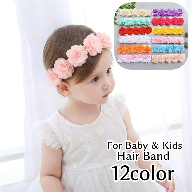 花冠のようなフラワーモチーフがかわいいベビー・キッズ用ヘアバンドです。