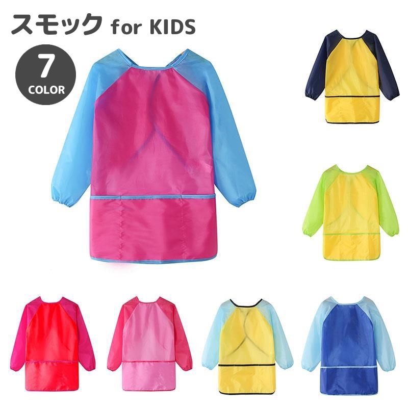 スモック お食事エプロン 子供用 キッズ 男の子 女の子 長袖 撥水 面ファスナー ポケット付 袖口ゴム お絵描き 工作 無地 カラフル 幼稚園 保育