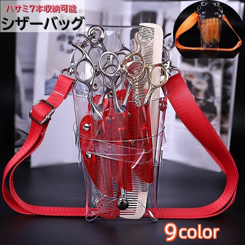シザーバッグ シザーケース 男女兼用 ショルダーバック 肩掛け ハサミケース はさみ入れ 7本 クリア 透明 ボタン式 取外し可能