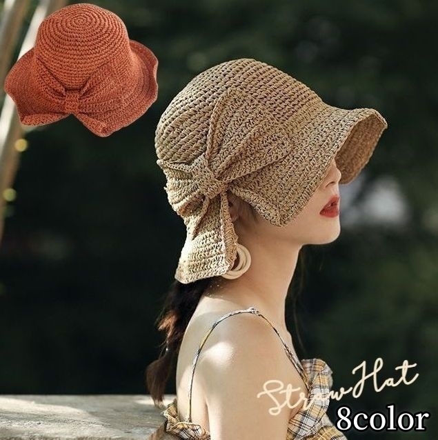 大きめのリボンが大人可愛いデザインのレディース麦わら帽子。