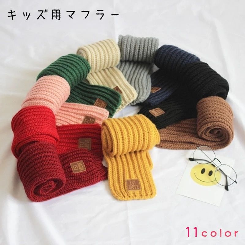 マフラー キッズ 子ども用 子供用 女の子 男の子 ファッション雑貨 防寒具 ニット 手編み風 タグ 英語 アルファベット 無地 ブラック ピンク グ