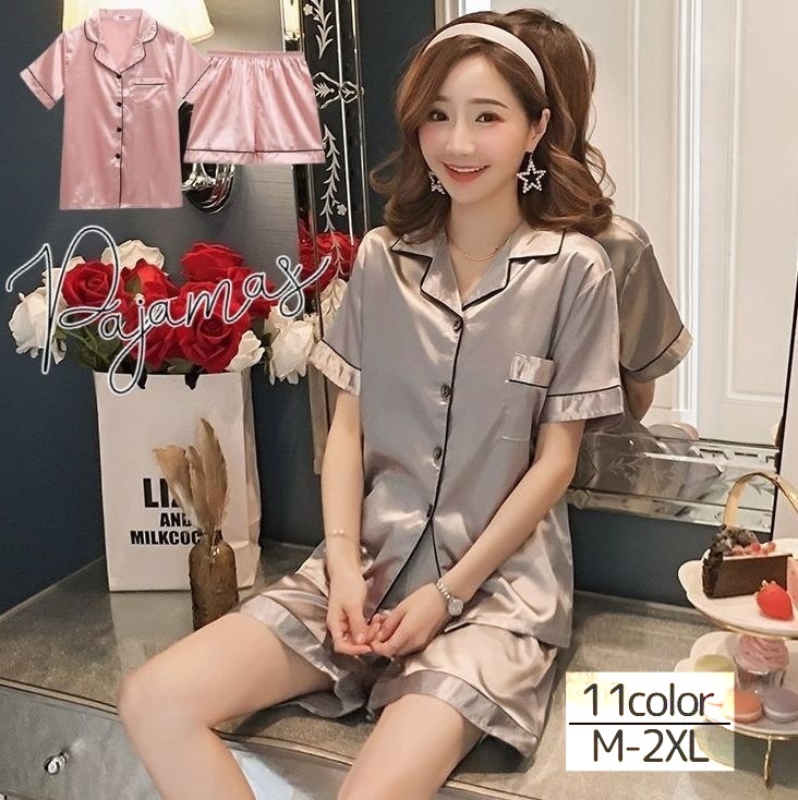 サテン調の光沢のある生地がおしゃれな半袖&ショートパンツのパジャマ。