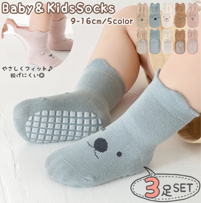 クルーソックス 同色3足セット ベビー キッズ 赤ちゃん 子ども 靴下 男の子 女の子 男女兼用 耳付き アニマル 滑り止め付き 耳付き クマ ウサギ