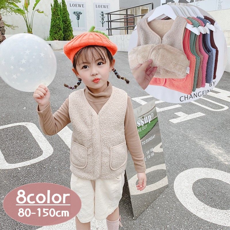ベスト 子供服 キッズ ベビー ジュニア 女の子 男の子 フリース ボア トップス Vネック ジップアップ 前開き 無地 シンプル カジュアル おしゃ