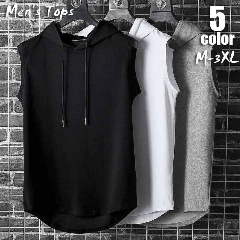 カットソーノースリーブ フード付き メンズ トップス タンクトップ パーカー 袖なし プルオーバー 大きいサイズあり 無地 シンプル 着回し 定番 カ