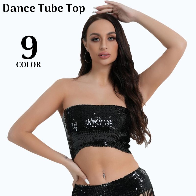 ダンス衣装 チューブトップ 女性用 ベアトップ へそ出しショート丈 スパンコール キラキラ セクシー ヒップホップ ステージ衣装