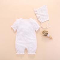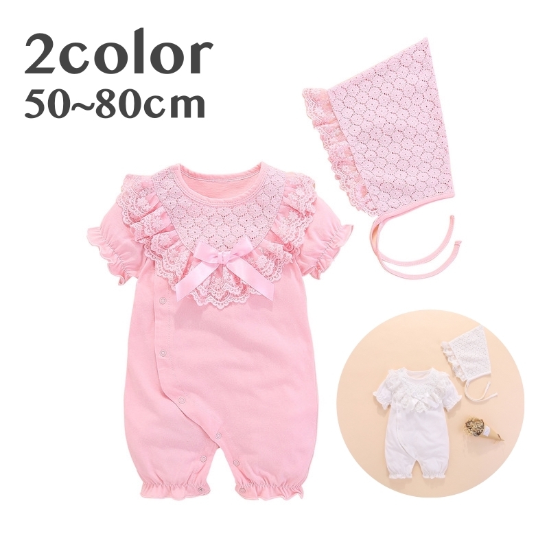 カバーオール 帽子付き ベビー服 赤ちゃん 子供用 キッズ 半袖 前開き ボタン 無地 レース リボン フリル つなぎ ロンパース 乳児 新生児 出産