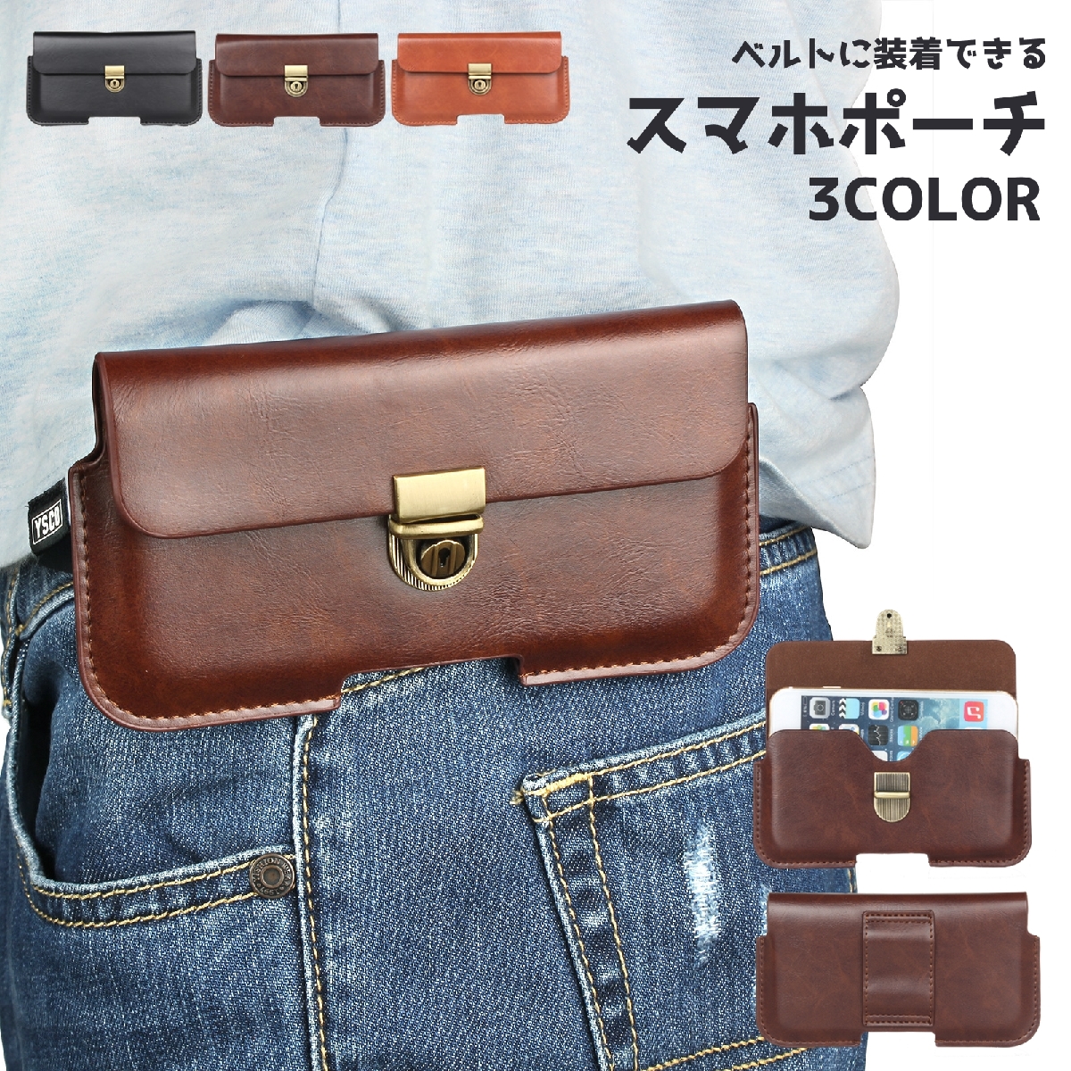 ウエストポーチ スマホポーチ ベルトポーチ ベルトに装着 スマートフォン 携帯 ホルダー ヨコ型 横型 レザー調 無地 単色 シンプル おしゃれ