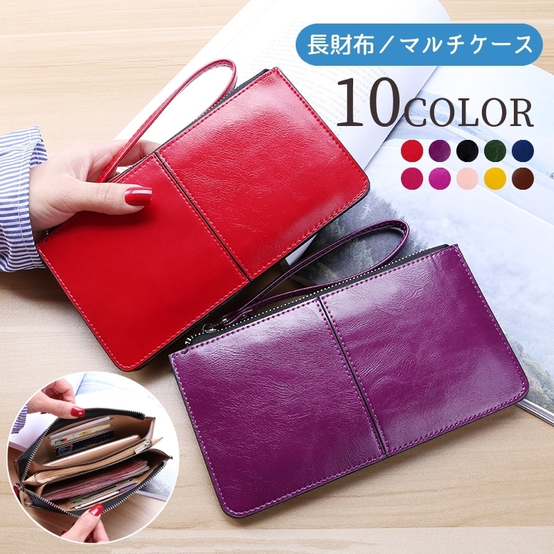 財布 長財布 レディース 女性 ウォレットケース マルチケース 通帳 母子手帳 大容量 カード入れ 小銭入れ ファスナー 薄い ストラップ付 無地 単