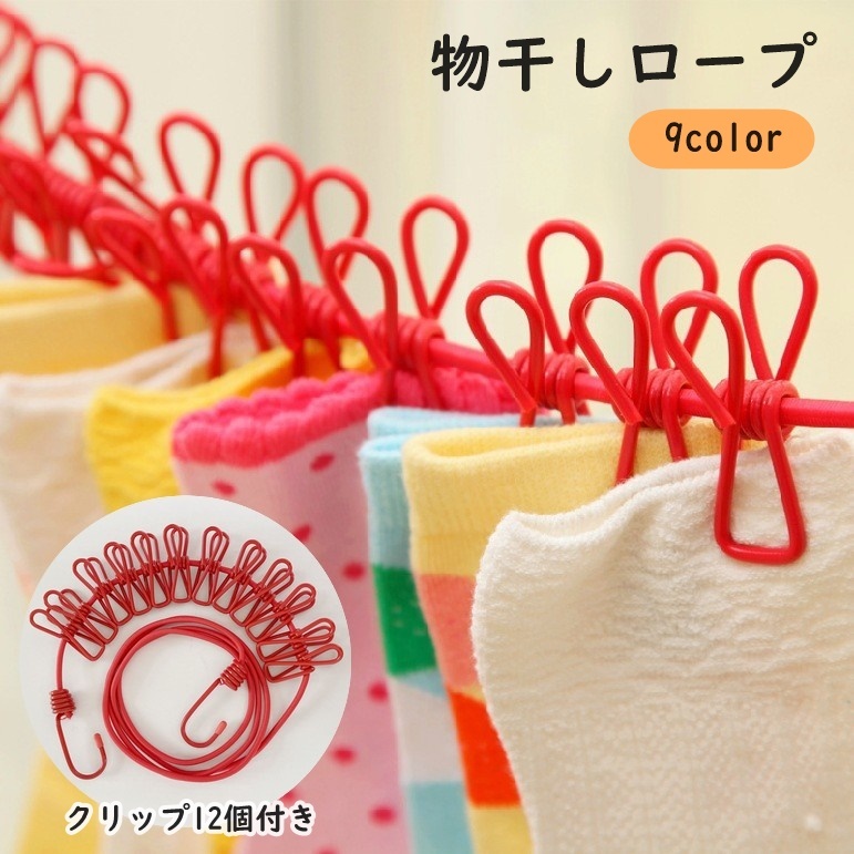 物干しロープ 洗濯物干し クリップ 洗濯ばさみ付き 12個 ストッパー 洗濯用品 収納ハンガー 室内干し 省スペース キャンプ 旅行 持ち運び