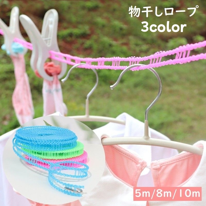 物干しロープ 洗濯ロープ 洗濯ひも 5m 8m 10m フック付き 引っ掛け穴あり 室内干し 屋外 持ち運び コンパクト 軽量 旅行 キャンプ 洗濯用