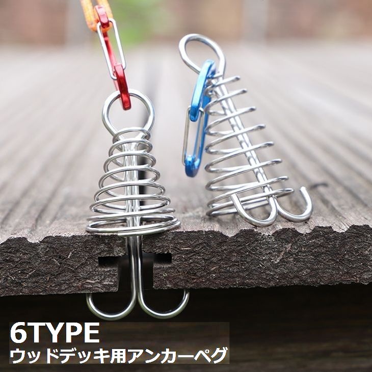 アンカーペグ ウッドデッキペグ 自在金具 カラビナ スプリング付き 魚骨型 留め具 フック テント キャンプ パラソルタープ アウトドア 軽量 小型