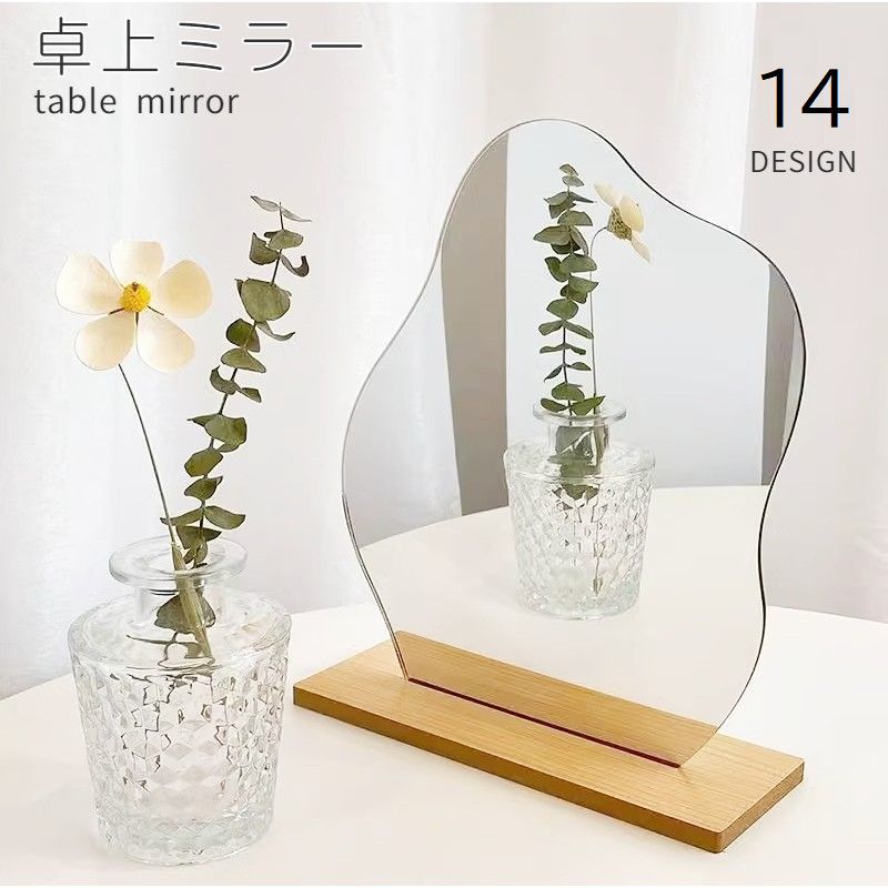 卓上ミラー 卓上鏡 スタンドミラー ウッド調 インテリア メイクミラー リビング 化粧鏡 お洒落 かわいい 変形 ウェーブ ラウンド かがみ ミラー