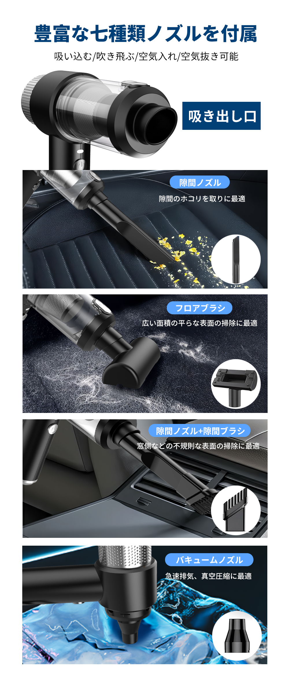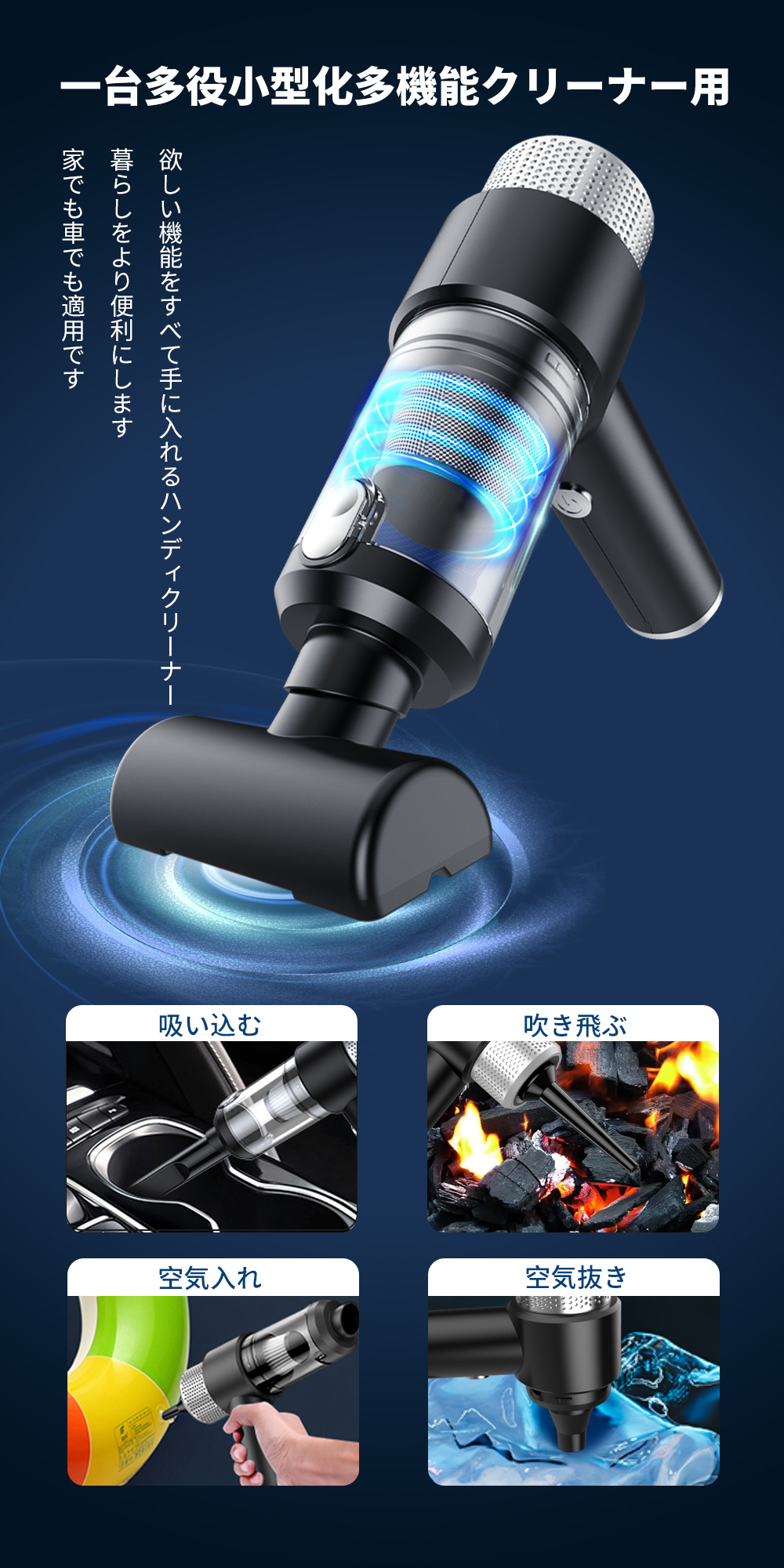 【多機能4-in-1車用掃除機】吹き飛ぶ、 吸い込む 、空気入れ 、空気抜き機能があります。コンパクトで軽量なので、車内に置いてもホコリやゴミを効果的に掃除できます。また、屋外での使用にも適しており、浮き輪や風船、エアマットレスへの充填にも使用できます。ご家庭では、ソファ、マットレス、窓、キーボードのコーナーなどのホコリやゴミを効果的に掃除できる多機能ポータブルフーバーです。
