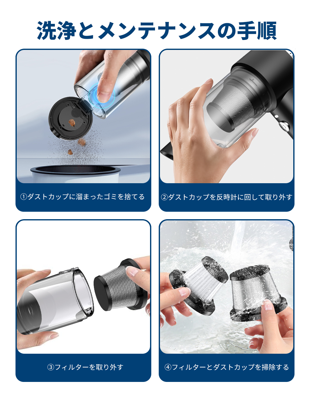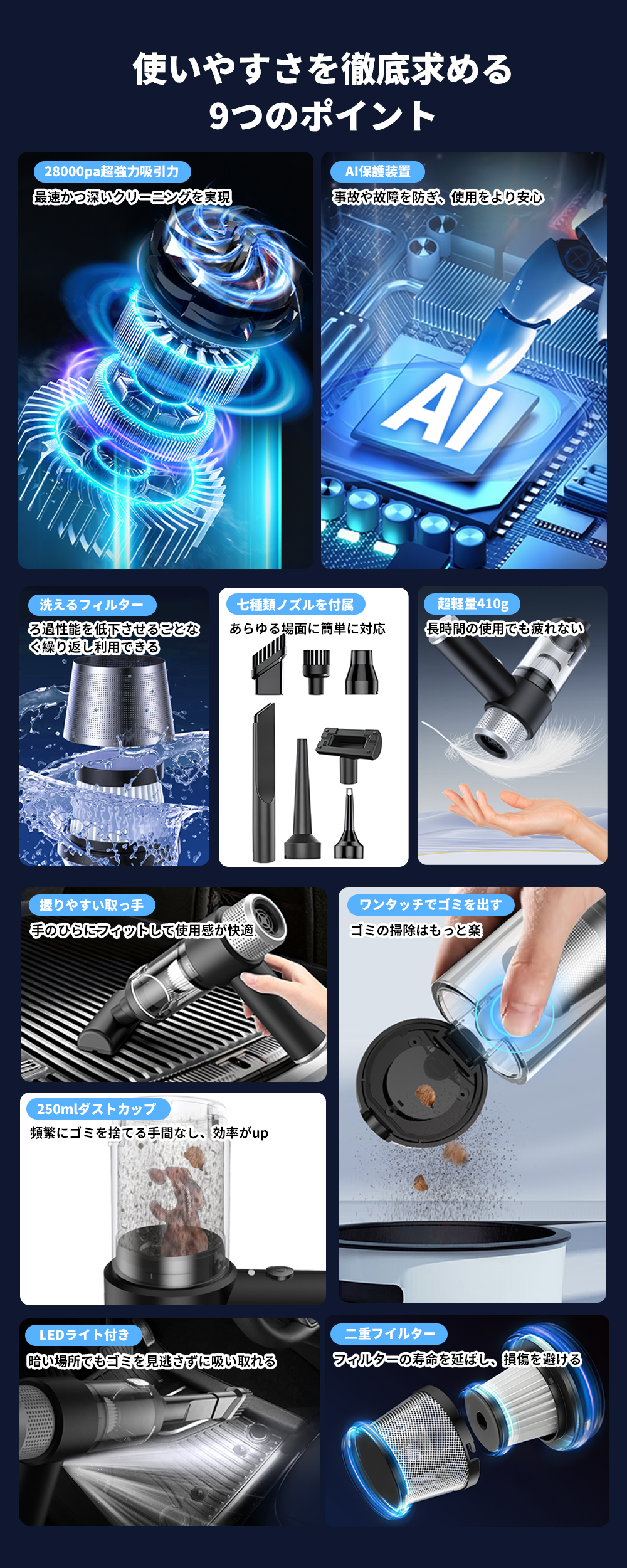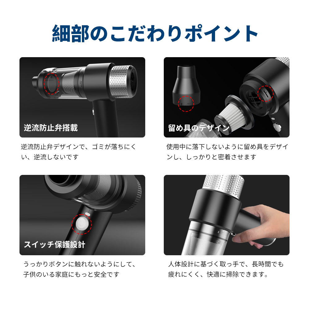 【十分な吸引力】ハンディクリーナーは、高速モーターを採用しています。強力な吸引力、低騒音、長寿命が特徴です。高速で回転するモーターのおかげで、最大の吸引力は28000Paと手に張り付いて落ちないほどです。