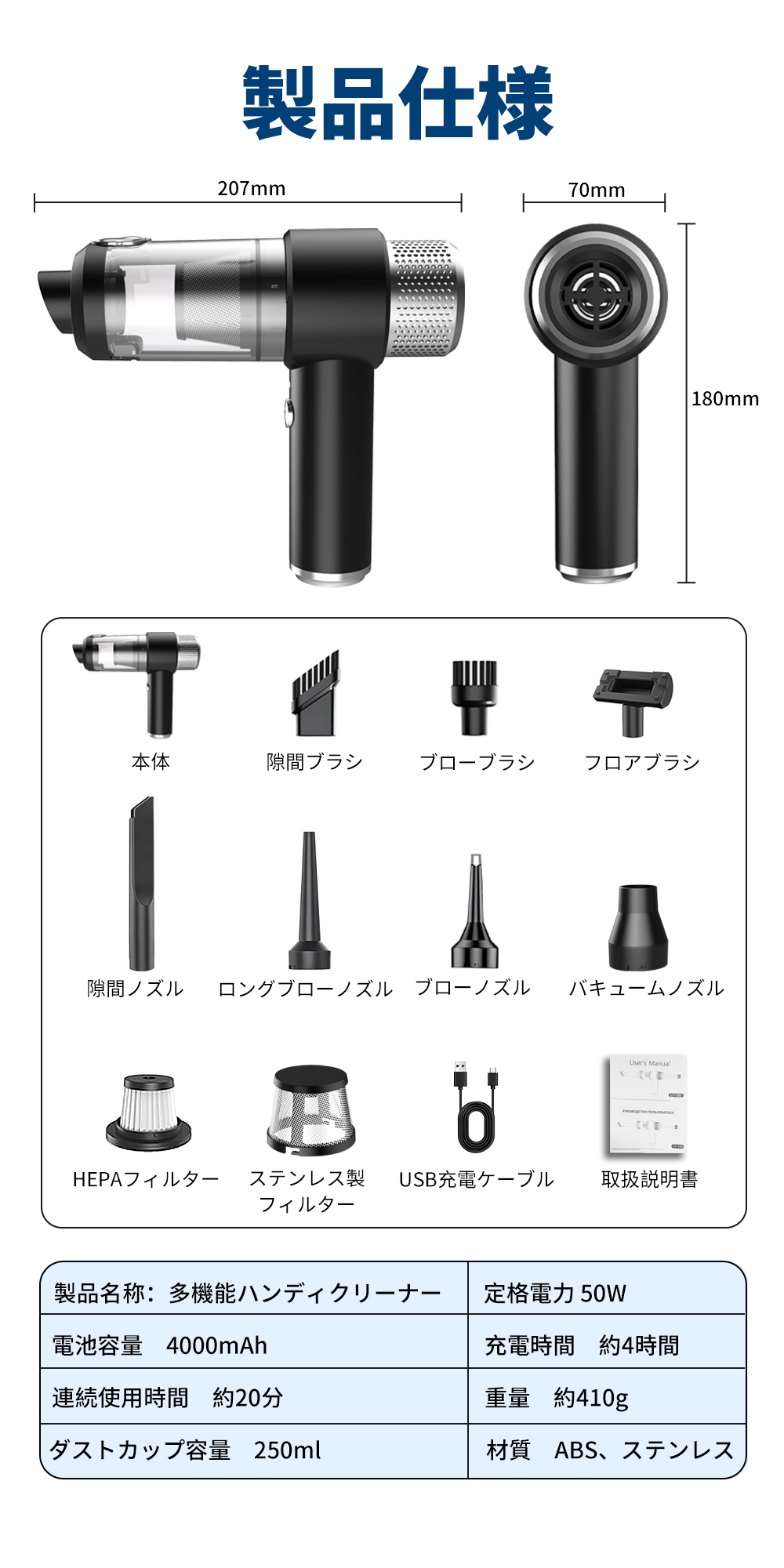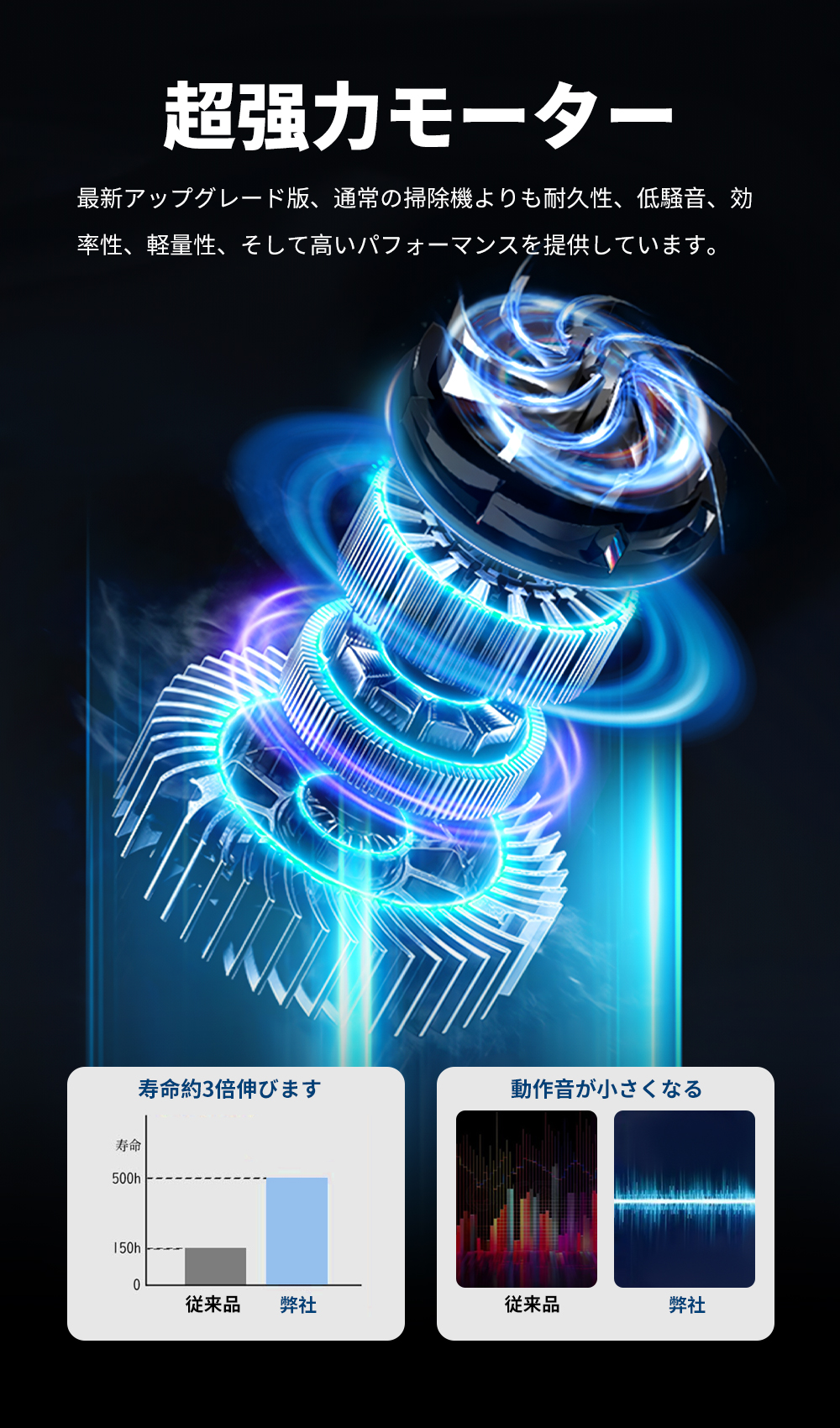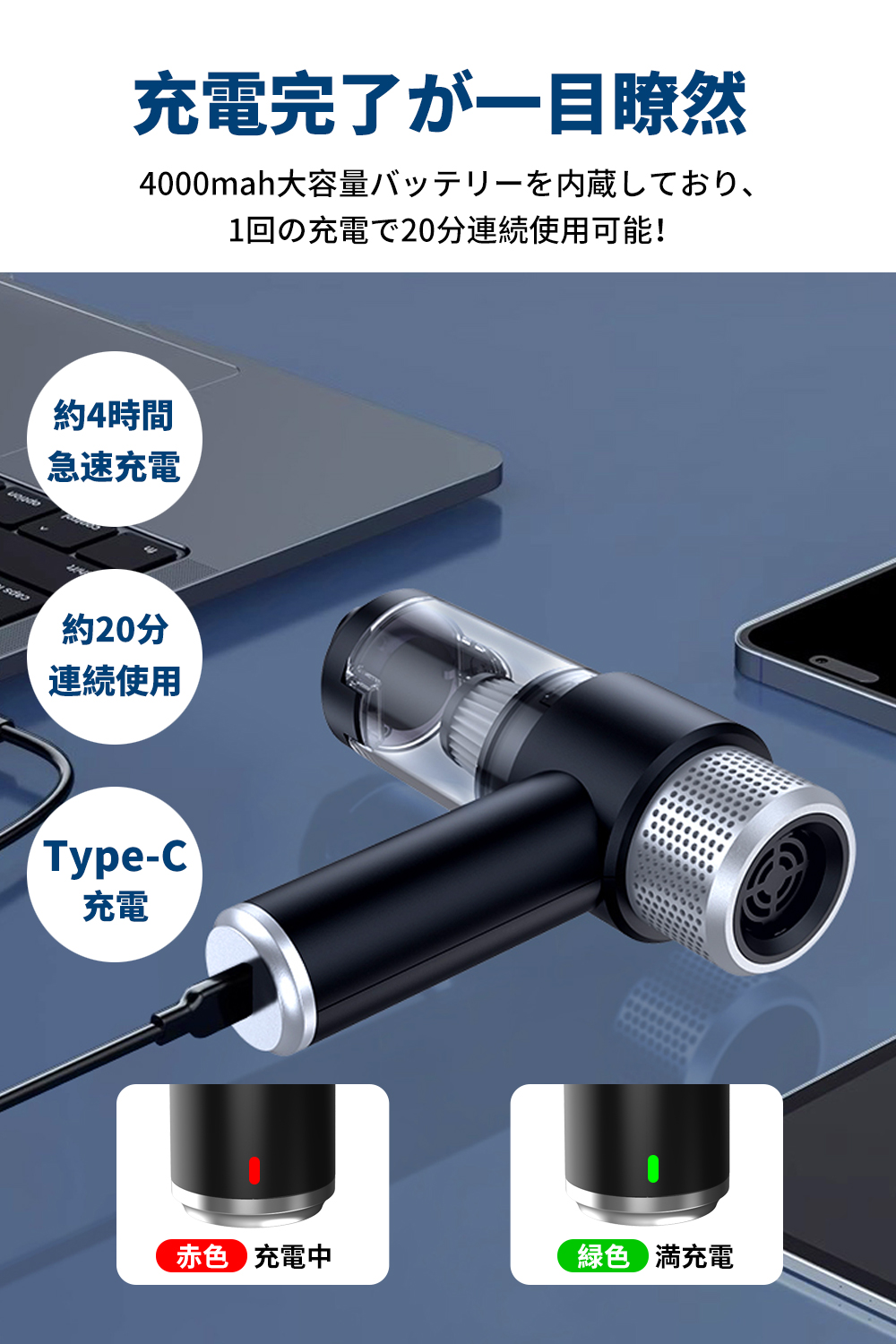 【十分な吸引力】ハンディクリーナーは、高速モーターを採用しています。強力な吸引力、低騒音、長寿命が特徴です。高速で回転するモーターのおかげで、最大の吸引力は28000Paと手に張り付いて落ちないほどです。