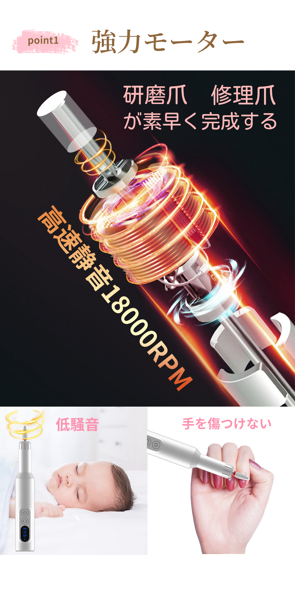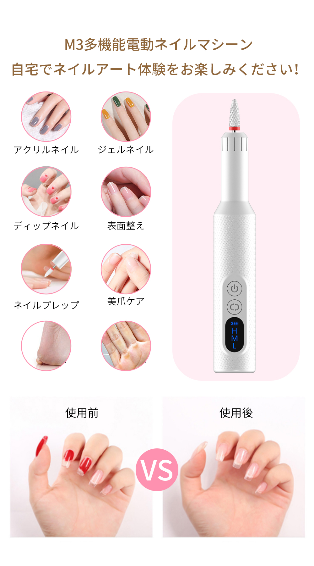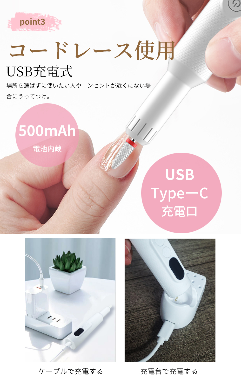 【コードレスUSB充電式&携帯便利】従来の電動ネイルケアは使用中充電しなければなりませんが、こちらのM3進化版のUSB充電式ネイルマシンは高品質なリチウムバッテリー(500mAh大容量)を採用、使用中充電しなくでも全然OKです、簡単に使用できます。