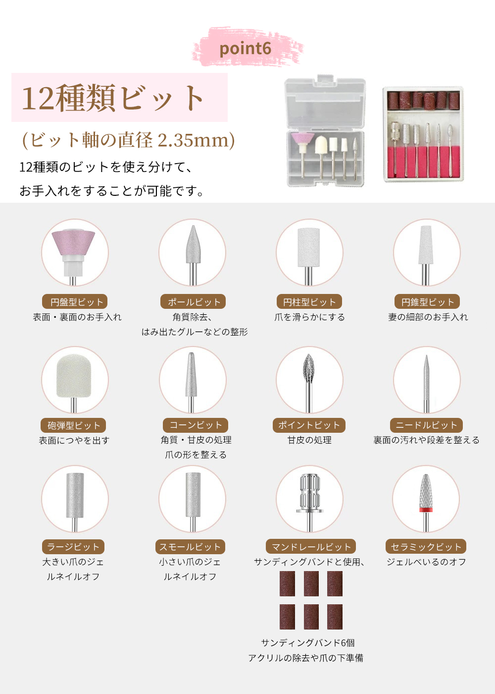 【12 in 1多機能ネイルケアセット】12つの取り外し可能なドリルが付属され、様々な爪トラブルに対応できます。爪の長さや形修正・甘皮処理・角質除去・小爪除去・爪表面の凸凹のケア・艶出し・ジェルオフなど、日常的な爪の手入れにも便利です。