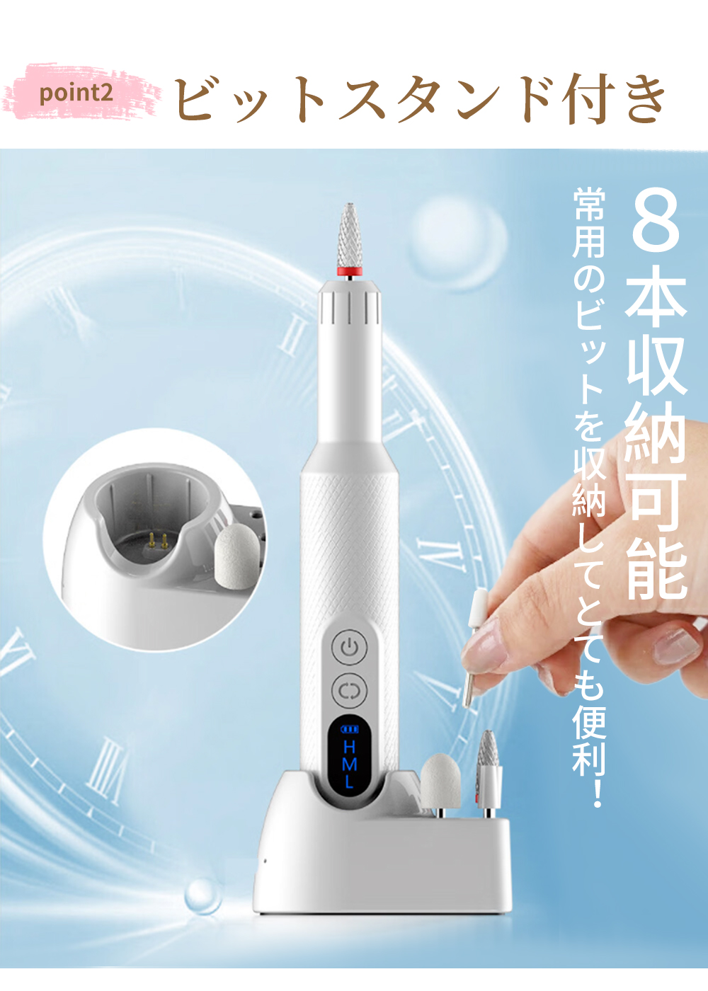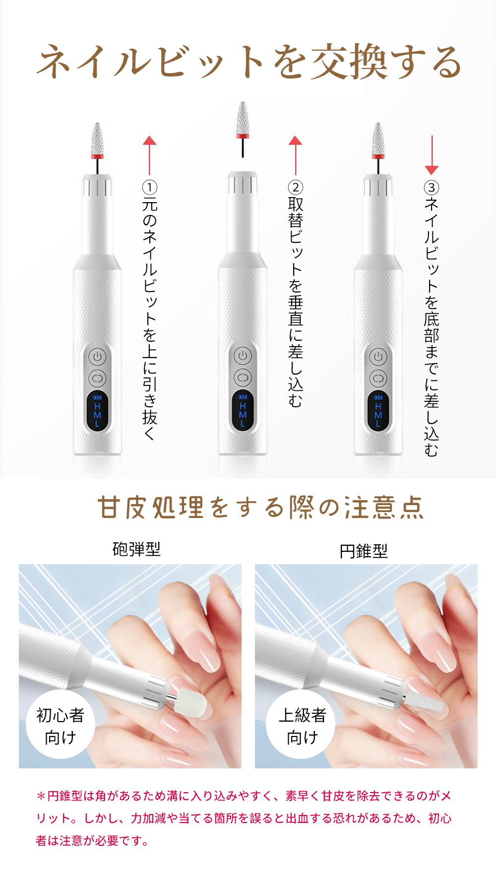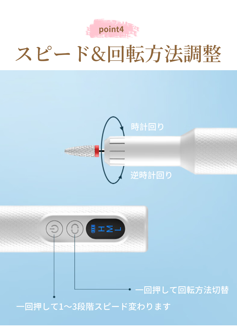ネイルマシン 電動 コードレス 低振動 500mAh大容量 バッテリー残量表示 ネイルケア 充電式 正/逆回転 初〜上級者モデル 自宅ケア