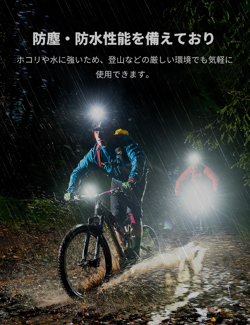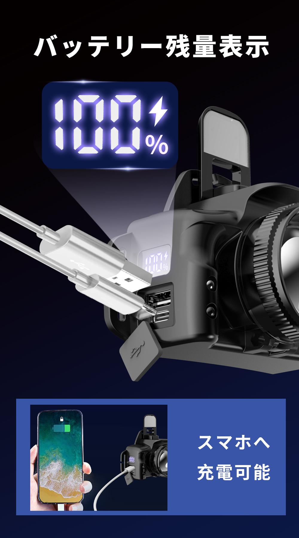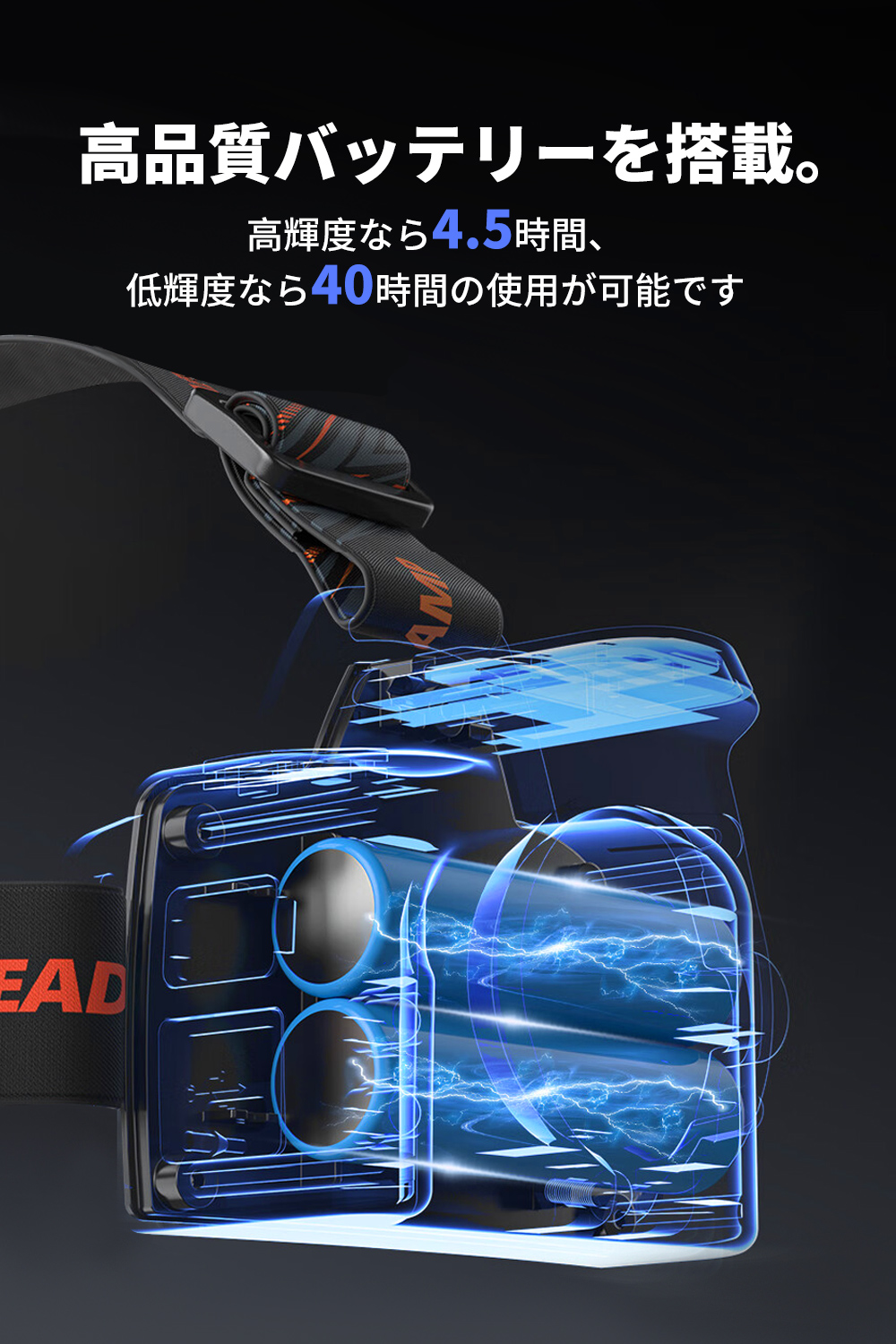 高品質バッテリーを搭載。高輝度なら4時間、低輝度なら40時間の使用が可能です。ディスプレイを搭載しており、電池残量状態が分かりやすいのも便利です。出力端子を搭載し、携帯やタブレット、GPSなどへの緊急充電が可能です。