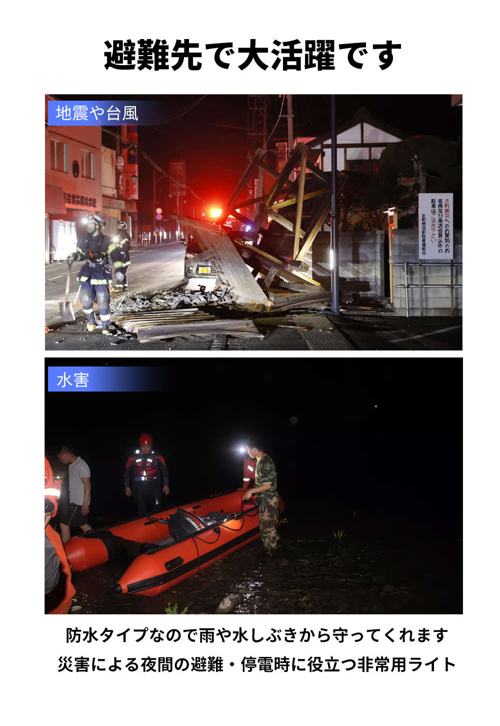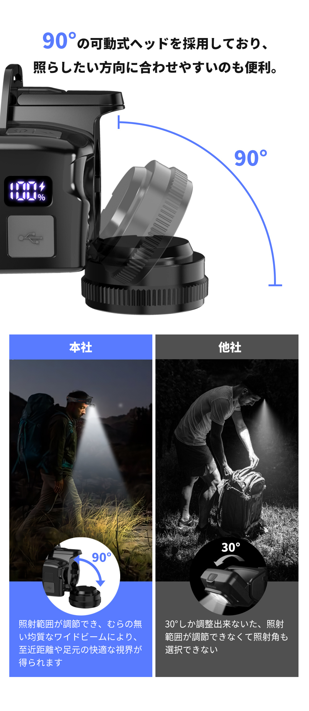 90°の可動式ヘッドを採用しており、照らしたい方向に合わせやすいのも便利。足元の状態をしっかりと確認しながら移動でき、遠くの状況を確認したり足元を照らしたりと、用途に合わせて見やすい照射角が選択できます。