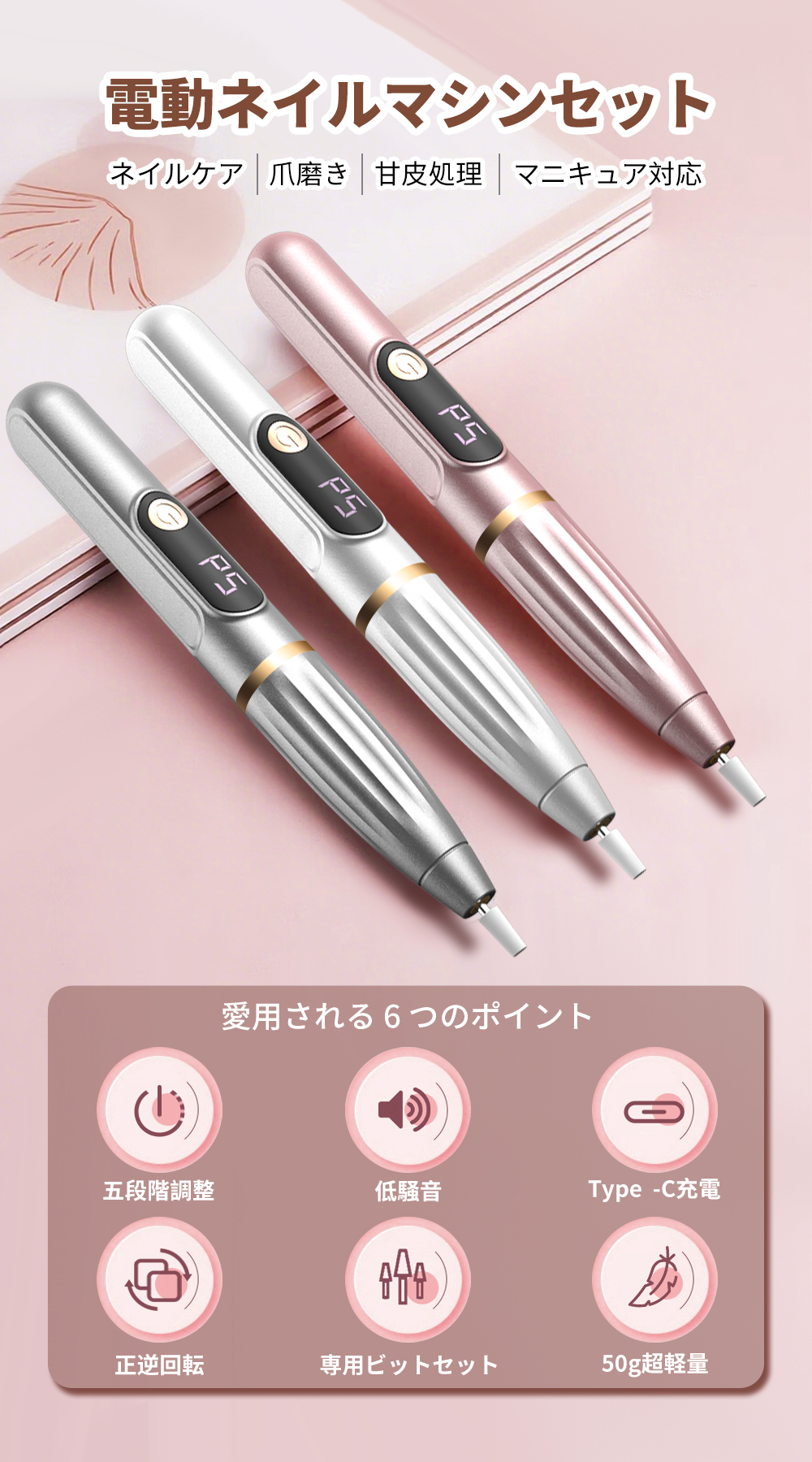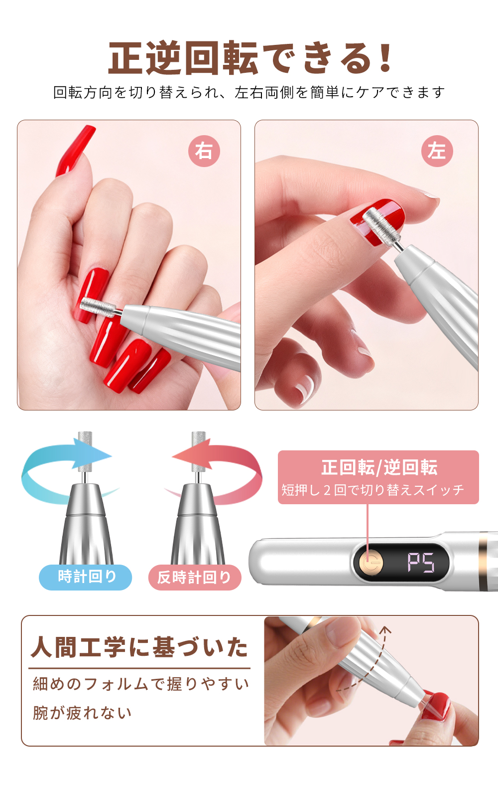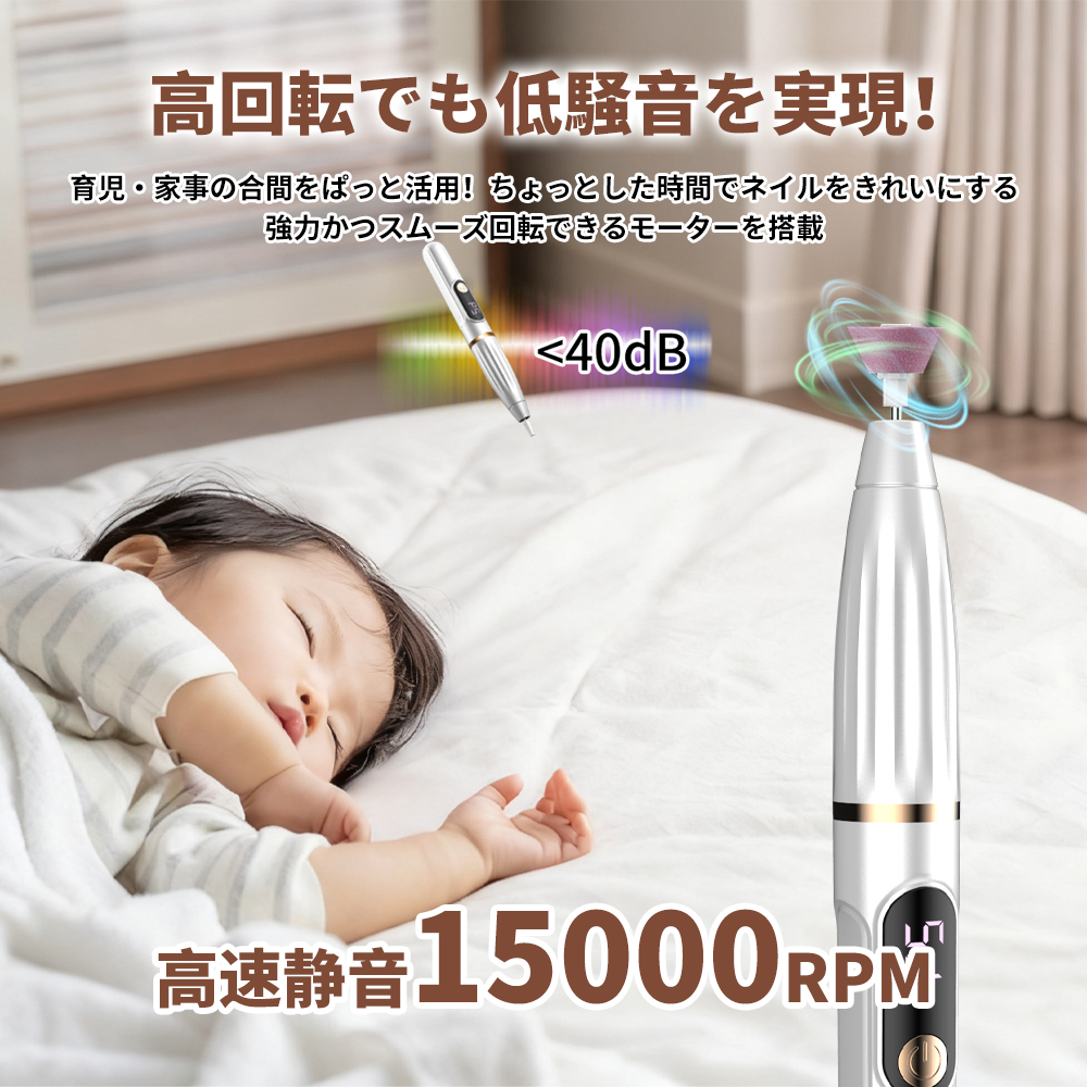 【高速回転&低騒音】パワフルの高速回転により、アクリルネイル形作り、カルス除去、ジエルネイルリッシュを除去、爪磨き、甘皮除去様々な状態に対応し、素早く滑らかに研磨できるため、時間と労力を大幅に節約できます。また、動作中の騒音は極めて低く、静かで快適な環境でネイルケアを完了できます。