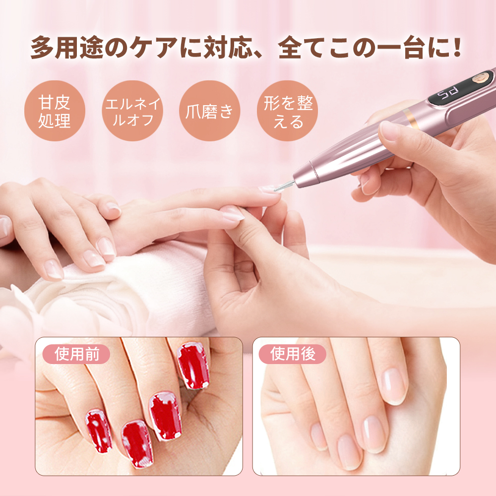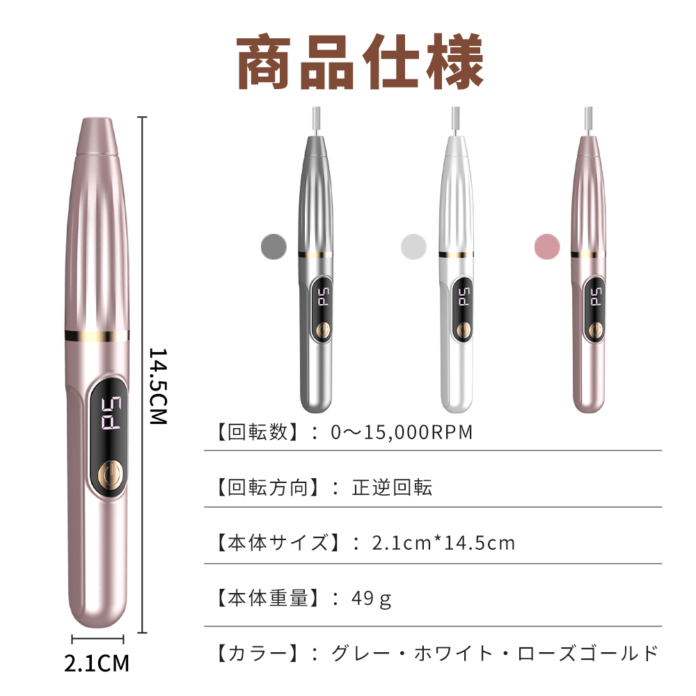 ネイルマシン 電動 ネイルマシーン 高速回転 コードレス 充電式 ネイルドリル マニキュア対応 ネイルケア 爪磨き 甘皮処理 低騒音 コンパクト 自宅用 初心者