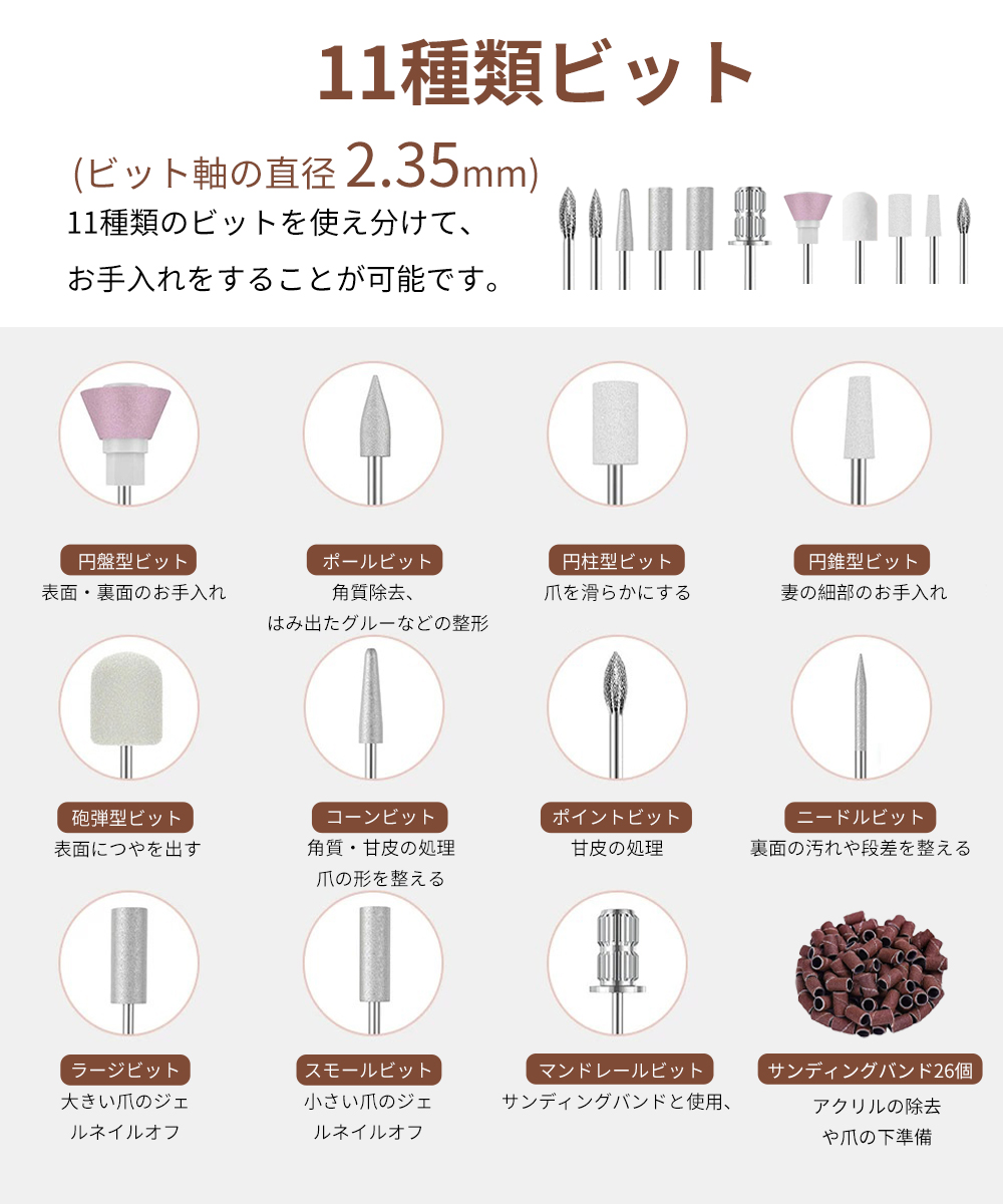 【11種類専用ビット】11種類のプロ仕様の専用ビットが付属されて、日常の爪磨き、特別なネイルケアなど、どんな用途にも最適なビットがあります。