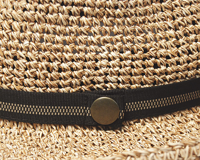 細めのリボンは帽子を折りたたんだ際にスナップボタンで留めておけるデザインで