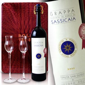 サッシカイアに使用された葡萄の搾りかすを使用。フレンチオークで4年熟成後、サッシカイアの熟成に使用したバリックでさらにもう1年熟成。サッシカイアに使用された葡萄の搾りかすを使用して造られたグラッパ(1本)と、グラッパ専用の手吹きのクリスタルグラス(2脚)のセット。<br><br>スーパータスカンとして有名なサシカイア(カベルネソーヴィニヨン80%、カベルネフラン20%)の絞り残しをヴェネトの名蒸留家ポリ社が蒸留・熟成してボトリング。しなやかな味わい。<br>サッシカイアに使用された葡萄の搾りかすを使用。フレンチオークで4年熟成後、サッシカイアの熟成に使用したバリックでさらにもう1年熟成。<br><br>香りについて<br><br>スパイスとコクを感じさせる印象があり、ヴァニラ、ココア、ナツメグ、リコリスの甘い香りとオークやコーヒー、番茶の香ばしい香りがある。ほのかにレザーや若い干草のような青いノートがある。