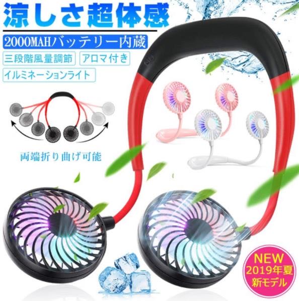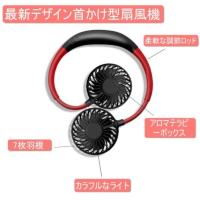 【360°回転】シリコン材質のアームで、360°調整でき、どの角度からも涼しい風が楽しめます。【首掛け/卓上/壁掛け】首掛け式デザイン、両手を解放されます。自宅のリビングやオフィスのデスクに卓上扇風機として、お風呂場や台所など熱がこもりがちな場所では壁掛け扇風機として、様々なシーンで活躍します。【アロマ機能】扇風機本体にスポンジケース付き、お好みの香水やアロマオイルを垂らせば、お部屋にふんわりと優しい香りが広がり、リラックスされます。【USB充電・ミュート設計】充電タイプリチウム電池を搭載し、Micro-USBポート付き、繰り返し充電して使用可能です。DCブラシレスモーターを採用、強力な風量を確保しながらも回転音が気にならないミュート設計です。【3段階調整・LEDライト付き】ダブルファンは風量が3段階調整可能です。クールカラフルモードがあり、LEDライト機能が付き、暗い環境でも快適に使用できます。LEDライトの照明が色変換でき、雰囲気を作る効果も抜群です。【パッケージ内容】扇風機*1、充電ケーブル*1、アロマシート*1、日本語取扱説明書