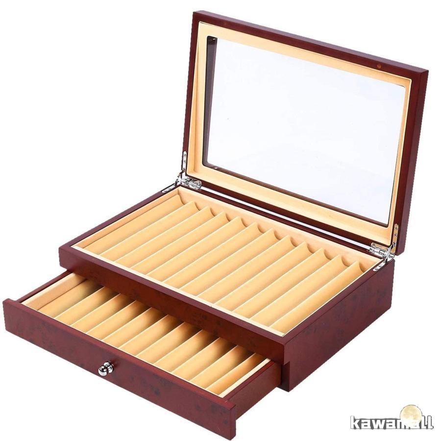 木製ペンケース 23本 万年筆ケースホルダー大容量 筆箱 万年筆展示スタンド ガラス窓付きペンコレクションボックストレイレッド