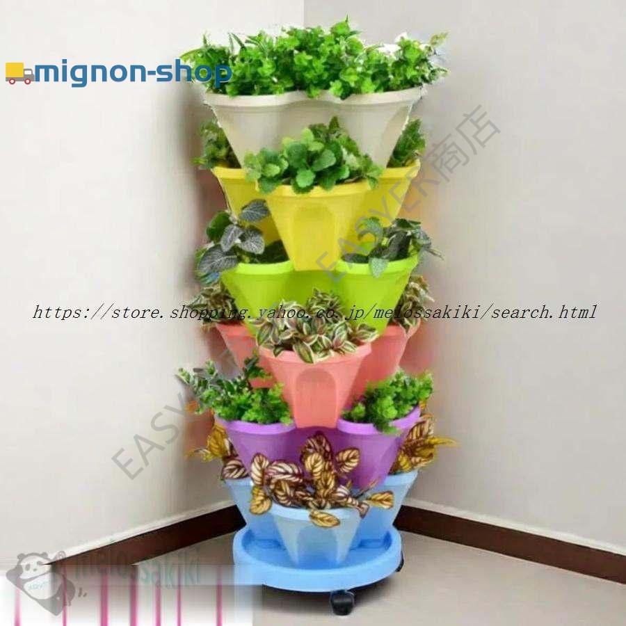 タワー型プランター 6段垂直ガーデンプランター ホイール付き 4バルブ プラスチック 積み重ね可能 イチゴ植栽ポット 屋内屋外用 庭の植木鉢 ガーデンタワー 花、