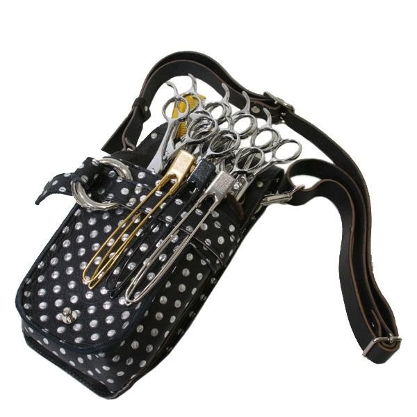 本体に使用している革は、ドットの型押しと同時に箔をのせ、裏から凹凸の型押しをすることで、スタッズを打っているような立体感を表現したイタリア製の革。シザー7丁対応、ウェスト/ショルダー兼用ベルト付きになります。