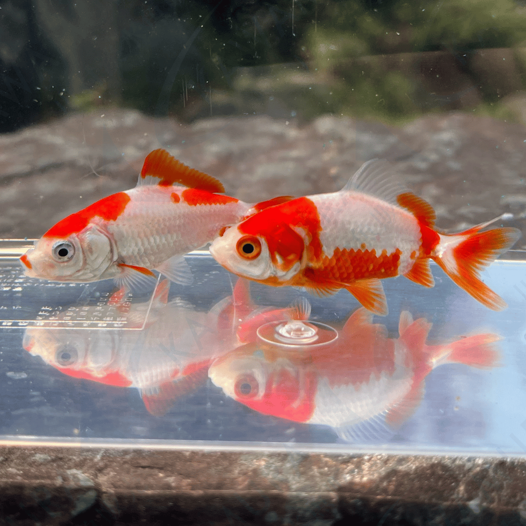 中国のフナの赤色変異種の突然変異個体です。日本へは室町時代末期にやってきたと言われており、金魚の原種とも言われます。胴体は長く頭が小さく、ヒレも小さめ。更紗和金ははっきりとした幾何学模様が特徴です。比較的俊敏な動きをします。丈夫な品種で飼育は容易です。