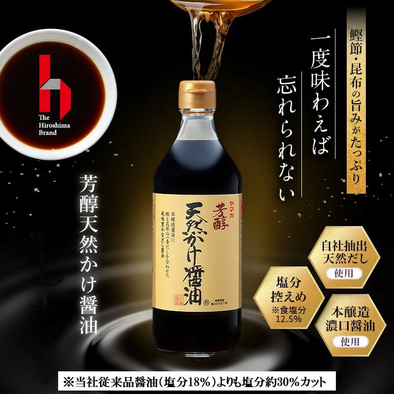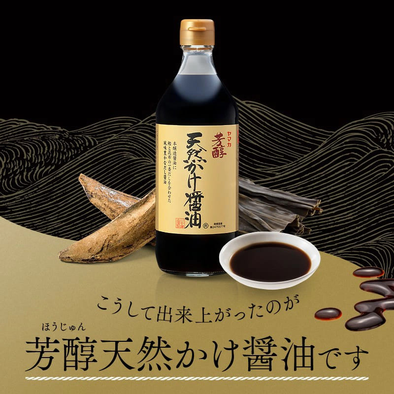 この商品は発売から20年以上経っているロングセラー商品です。愛されるその理由はやっぱり味!芳醇天然かけ醤油は、幾重もの味が重なった奥深い風味とほのかな甘味が特徴です。鰹と昆布のだしが後味の良い口あたりを実現しています。